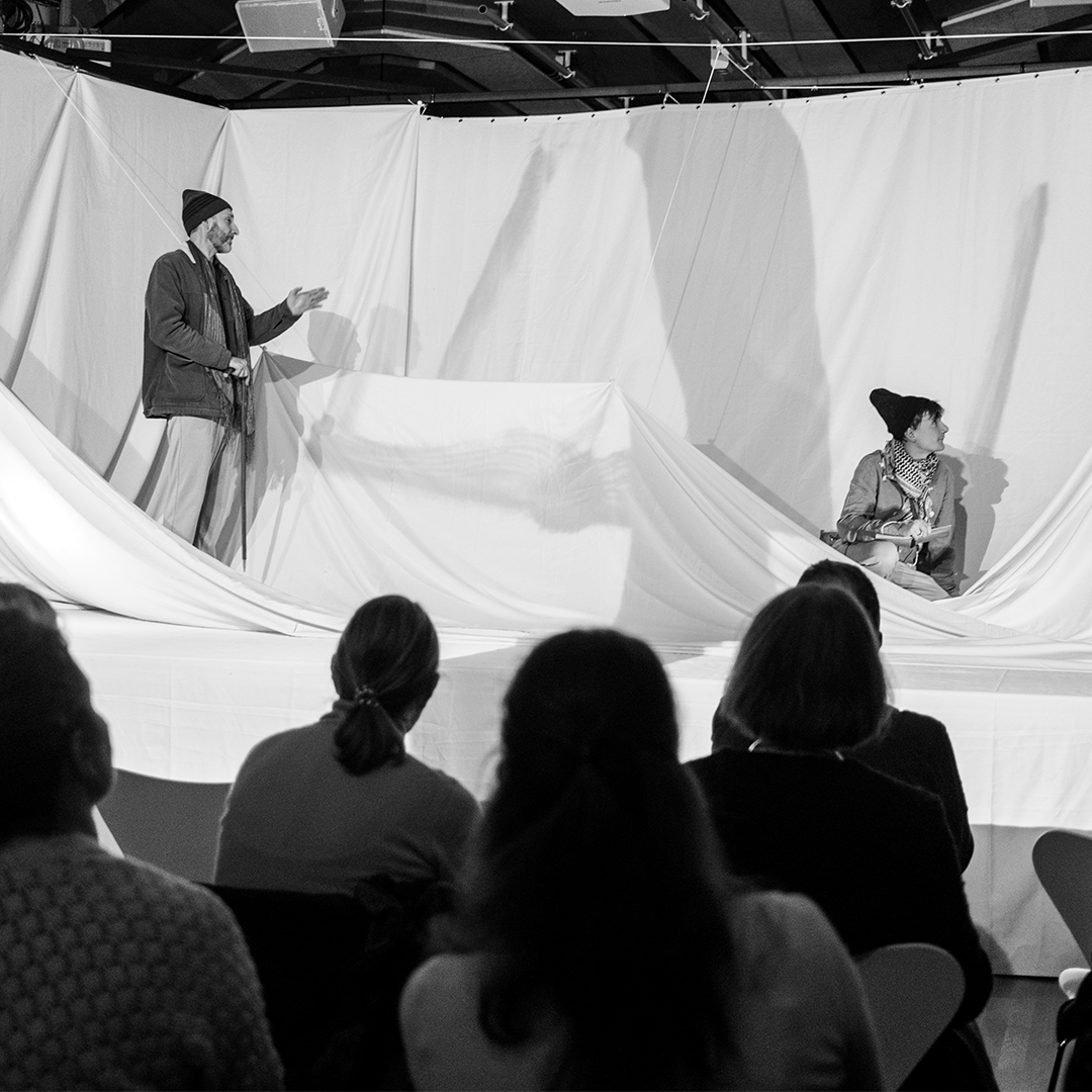 La scène est magnifiquement épurée. Elle est composée de toiles couleur blanc cassé qui se meuvent au gré de cordes tirées par les deux acteurs. Devant nos yeux, le décor se transforme tour à tour en désert, église ou fond marin dans lequel Théodore Monod et le professeur Auguste Piccard s’immergent avec le Bathyscaphe. Une discrète projection, accompagnée d’effets sonores, effleure le tissu et plonge les spectatrices et les spectateurs dans un univers qui nous déracine à plusieurs milliers de kilomètres du CIP Tramelan, lieu de la représentation. Bienvenue dans la Majâbat al-koubrâ, « désert des déserts », large étendue de sable entre la Mauritanie et le Mali. Là, Monod y chercha des vestiges du Néolithique tels que des vertèbres de poisson. Ces immensités furent marines.